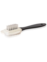 Резиновая сторона улучшает качество чистки обуви. Для чистки жесткой части изделий используется нейлоновая сторона щетки. Для эффективной чистки рантов и швов используются боковые стороны. Щетка предназначена для удаления загрязнений и восстановления изделий из нубука.